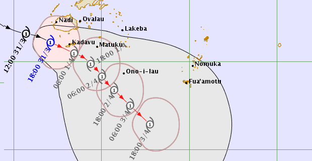 The Weather Office says on this track, the Cyclone centre is expected to be located about 60 kilometres south-southeast of Kadavu at 6pm today.
