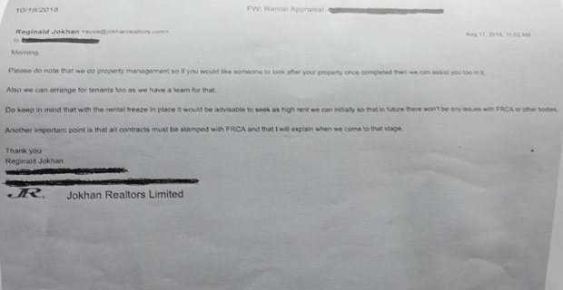 Jokhan who is the Managing Director of Jokhan Realtors Limited says they had even said in the email to a client that the contract has to be stamped with Fiji Revenue Customs Service however the NFP has not touched on it where he is following the system by getting the client to pay Revenue and Customs the stamp duty.