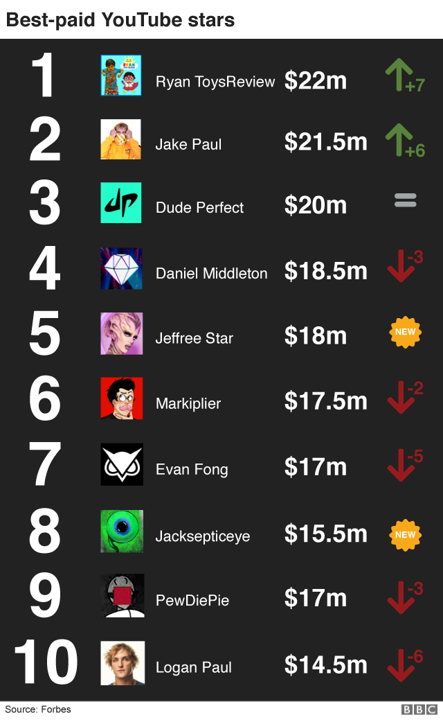 Forbes said all but $1m of the $22m total is generated by advertising shown before videos, with the remainder coming from sponsored posts.