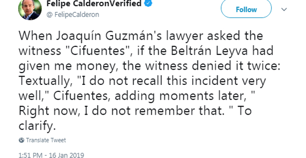Mexican President Enrique Calderón denied that he ever received any payments. "The claims made by Joaquin 'El Chapo' Guzman's lawyer are absolutely false. Neither he nor the Sinaloa cartel nor anyone else made any payments to me," he wrote on Twitter.[Source:CNN]