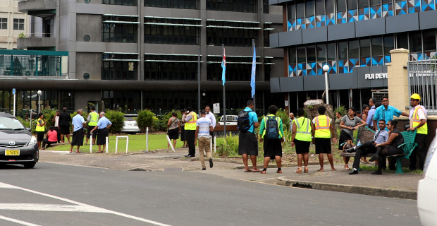 People evacuated from Ro Lalabalavu House waiting outside along Queen Elizabeth Drive