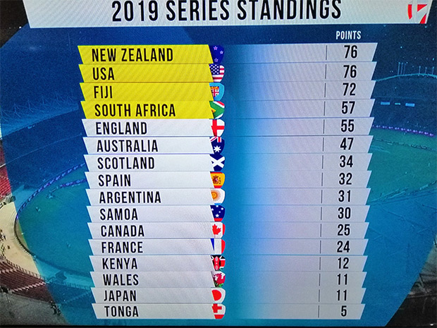 Looking at the HSBC Sevens Series standings after four tournaments, New Zealand and USA lead the series with 76 points, Fiji is third with 72 points while South Africa is fourth with 57 points.