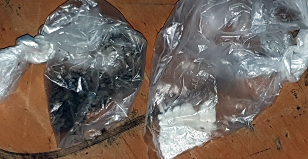 Police seized white substances believed to be methamphetamine and dried leaves believed to be marijuana as well as smoking apparatus.