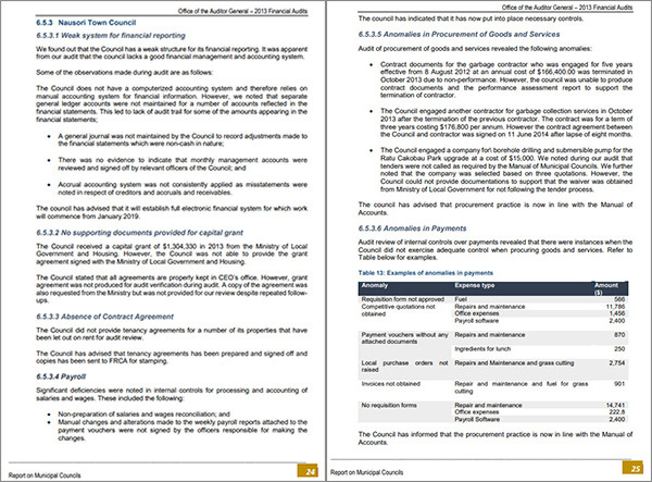 The Auditor General’s Report on Municipal Councils for 2013 has revealed that Nausori Town Council has a weak structure for its financial reporting and the council lacks a good financial management and accounting system.