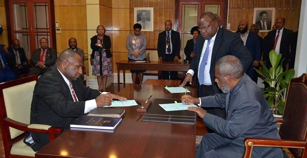 James Marape left being sworn in as prime minister of Papua New Guine by the governor general Sir Robert Dadae. 30 May 2019 [Photo:PNG prime minister's office media]