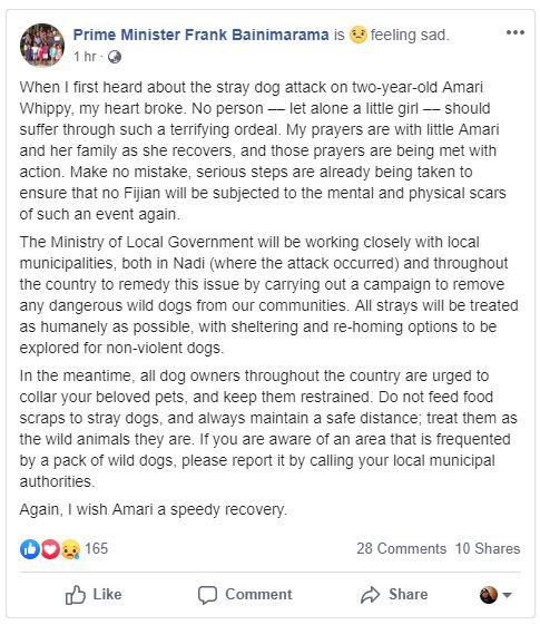 On his official Facebook page, Bainimarama said the Ministry of Local Government will be working closely with local municipalities, both in Nadi where the attack occurred and throughout the country to remedy this issue by carrying out a campaign to remove any dangerous wild dogs from our communities.