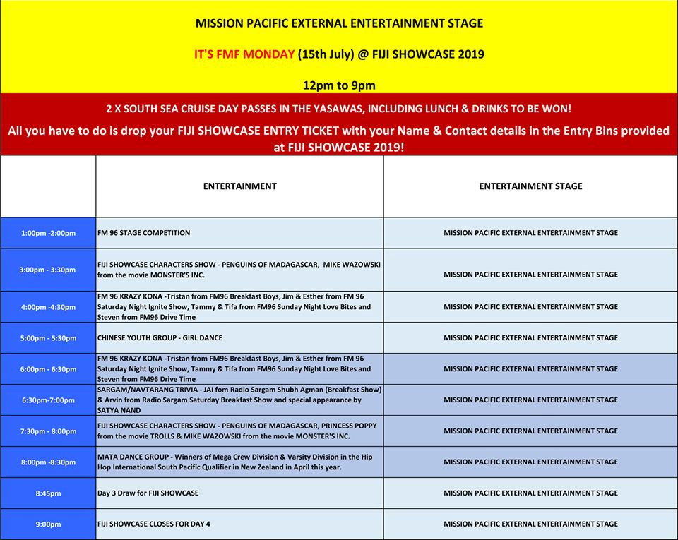 Its FMF Monday at the Fiji Showcase with gates opening at 12pm and the FM96 Stage competition on from 1pm to 2pm.