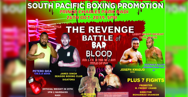 James Singh will face off again with Petero Qica for the Heavyweight Title of Fiji while Jese Ravudi will fight Ratu Rakuro Daunivavana for the Super Welterweight Title of Fiji.